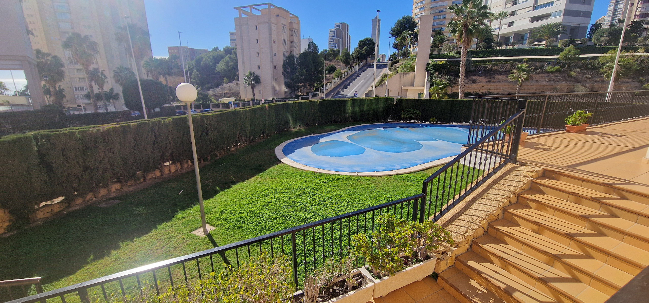 Il dispose d'un ascenseur, jardin, terrain clôturé, lave-linge, fer à repasser, chauffage par pompe à chaleur, climatisation uniquement dans le salon, piscine communautaire (en été), parking communautaire (pas de place garantie) à l'extérieur dans le même bâtiment, 1 TV .